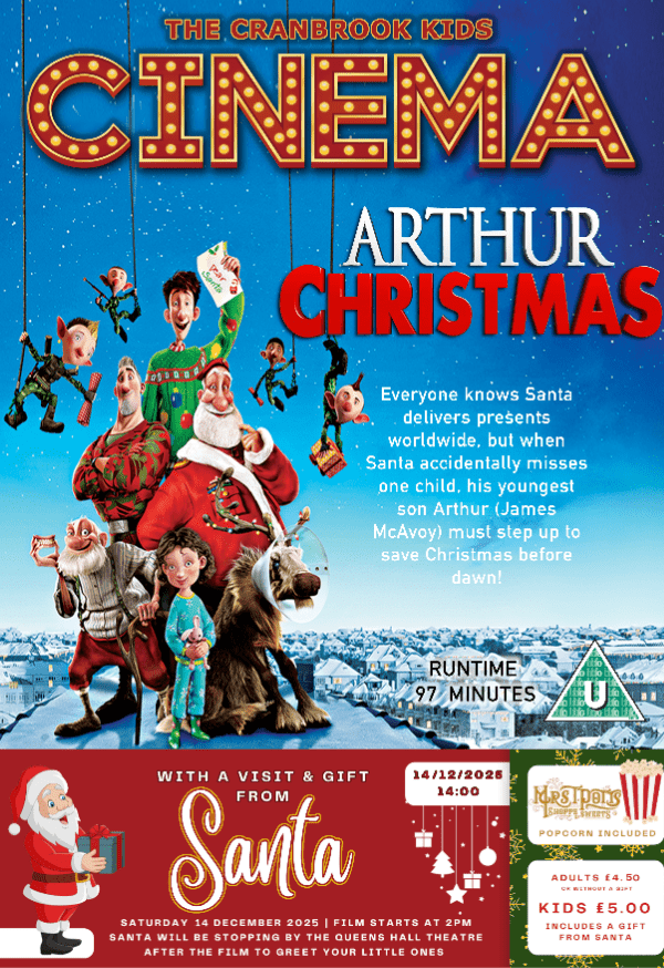 Only £5 for kids (including a small gift from Santa/Arthur) and £4.00 for adults or kids that don’t want to see Santa – Saturday the 7th of December at 14:00 All tickets include a small bag of popcorn from Mrs T Potts Shoppe of Sweets!